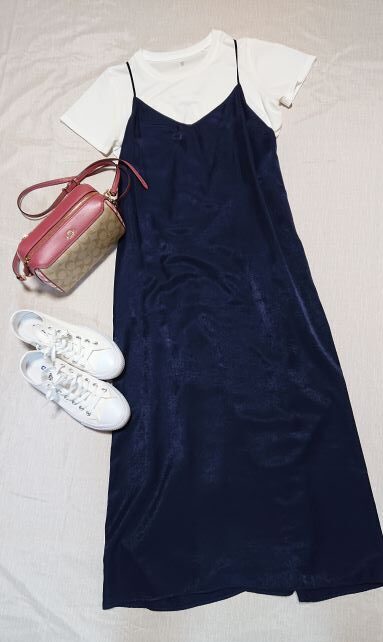 このネイビーワンピは着ててとても涼しいので暑い夏には最高の一着です 外でみると光沢というか艶があるような?ただの紺色ではないような気がします 太陽の下ではキラキラしてるように見えます 手頃な値段で買えて ”いいもの見つけた!” って感じです 着ててとても軽いです